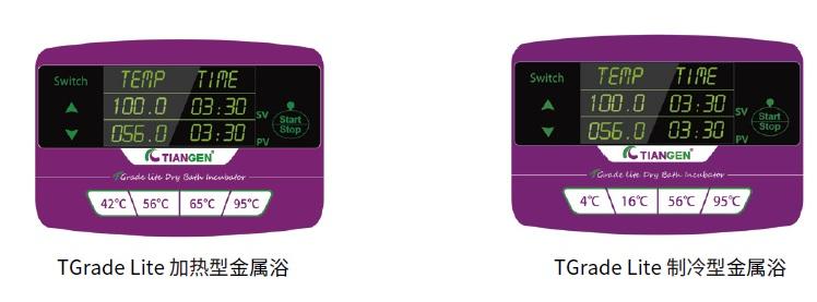 TGrade Lite 金属浴是一个单段程控的干式金属浴。加热型金属浴可维持在室温到105℃的指定温度,4个快捷温度键分别为:42℃、56℃、65℃、95℃,可一键快速设置温度;制冷型金属浴可维持在-10℃到105℃的指定温度(要实现-10℃,环境温度需要在15℃以下),4个快捷温度键分别为:4℃、16℃、56℃、95℃,可一键快速设置温度。