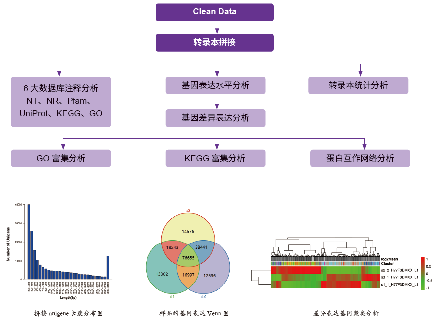 真核无参(De novo)转录组是研究没有参考基因组的物种,通过转录组测序技术,能从 mRNA 水平全面地研究物种基因功能,揭示特定的生物学过程。对于没有参考基因组的物种,或者基因组组装不好的物种,必须先使用测序数据将小片段拼接成 unigene,组装一套参考转录本,从而进行多个样本的差异基因表达分析和差异基因功能富集分析等。目前已广泛应用于基础研究、分子育种等领域。