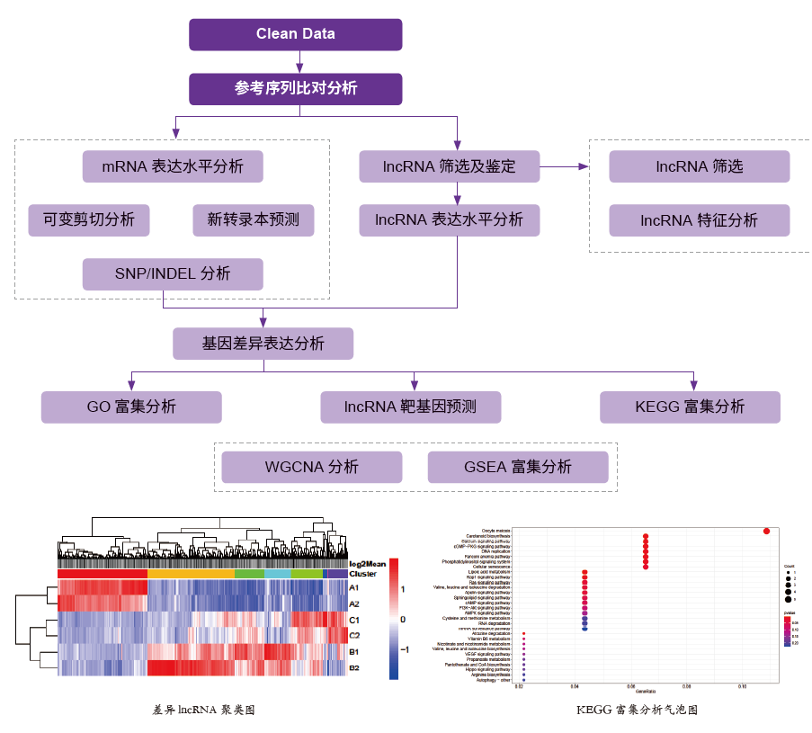 LncRNA 测序( Long non-coding RNA )是指已有参考基因组的真核生物,从 lncRNA 水平全面地研究物种基因功能、调控机制等,揭示生物体特定的生物学过程。lncRNA 是一类长度大于 200 个核苷酸的 RNA,通常不编码蛋白质。一次 lncRNA 文库构建,可获得样本中几乎全部的 lncRNA 和 mRNA 信息。通过 lncRNA 和 mRNA 整合分析,挖掘受lncRNA 调控的关键基因,从而快速准确地获得与特定生物学过程相关 lncRNA。研究表明,lncRNA 在表观遗传调控、细胞周期调控和细胞分化调控等众多生命活动中发挥重要作用,成为遗传学研究热点。