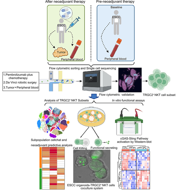 食管癌科研中,“精准定位治疗反应标志物” 是核心难题,而单细胞转录组测序技术正为其破局!《Cancer Cell》(IF=48.8)可切除食管鳞状细胞癌的前瞻性研究中[1],借单细胞技术锁定 TRGC2+ NKT 细胞标志物,印证其临床转化潜力与冲高分价值。