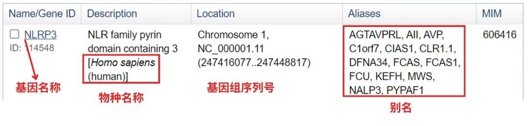 在搜索结果中选择正确的基因名称或基因ID进入详细信息页面。