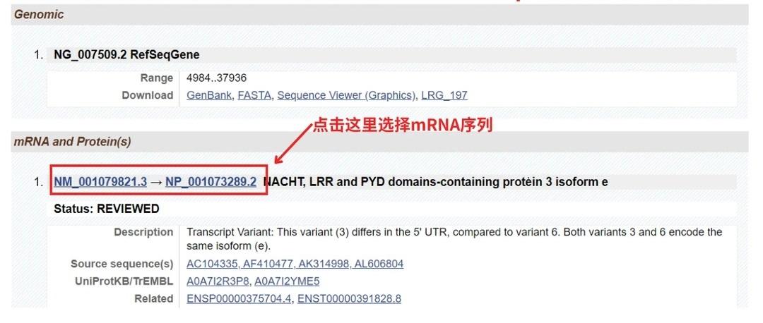 点击基因名后跳转的页面下拉,找到mRNA and protein,点击NM号
