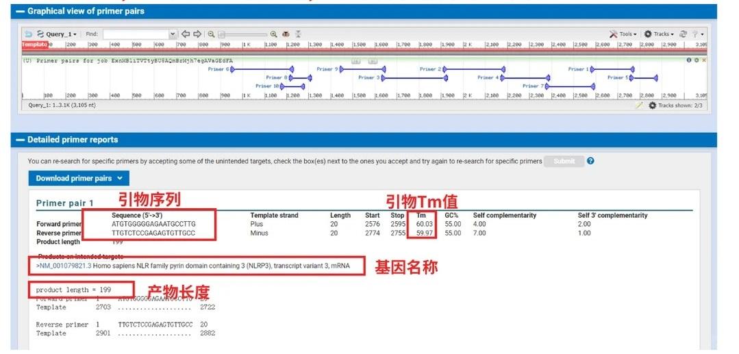 pick Primers后自动填入基因序列号,设定所需产物大小及退火温度