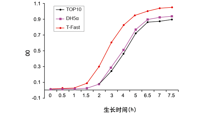 ■ 快速生长:菌株生长快速,涂布于琼脂平板后 6 h 可见菌落, 8 h 可挑取单克隆菌落;过夜培养的单克隆菌落于 3 ml 液体LB培养基中培养 4h 即可用于质粒提取。