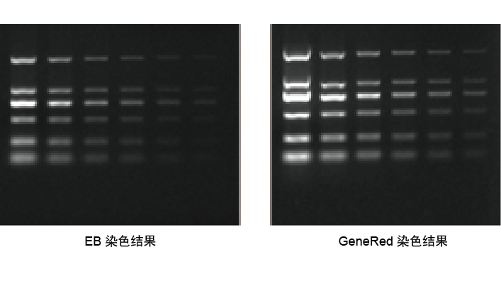 GeneRed 红色核酸染料是一种代替 EB 的安全核酸染料, 其原理是油性大分子,不易挥发,不能穿透细胞膜进入细胞内,该染料的诱变性远小于 EB,该产品适用于各种大小片段的电泳染色,对核酸迁移的影响较小,具有高热稳定性,适用于使用微波或其它加热方法制备琼脂糖凝胶。