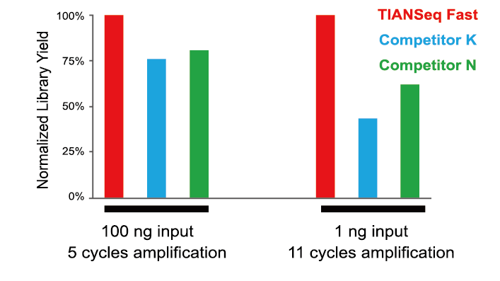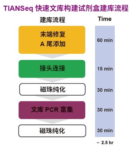 TIANSeq Fast DNA Library Kit(Illumina) 是专门针对于Illumina 高通量测序平台所优化的 DNA 文库构建试剂盒。本产品可将经超声处理、化学处理、酶处理的片段化双链 DNA 或小片段 DNA 的末端修复和 3’端 dA 尾添加在一管内一步法完成,同时所得产物无需纯化,可直接用于adapter 的连接。另外,本试剂盒配备的 PCR 扩增试剂经过专门的优化,扩增所得 DNA 序列产量高,保真度好、无碱基偏好性。本产品采用一步法的反应流程,省去了多步纯化步骤,整个文库构建流程仅需2