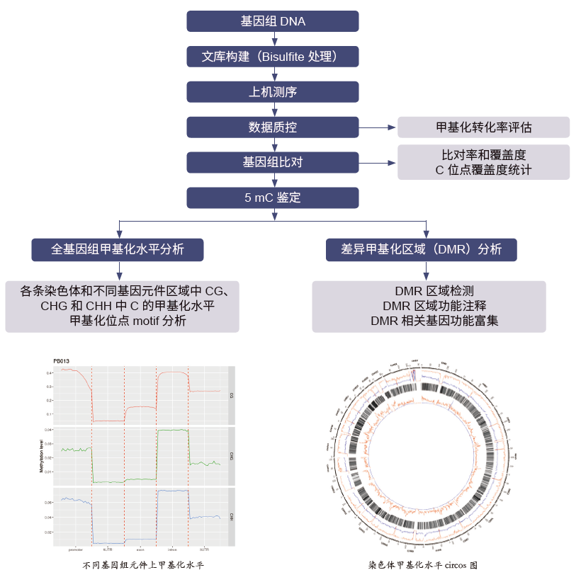 全基因组甲基化测序(Whole-genome bisulfi te sequencing,WGBS)结合了亚硫酸氢盐转化方法与高通量测序技术,通过生物信息分析方法,对有参考基因组信息的物种进行全基因组范围内的单碱基分辨率的甲基化水平的高效检测。亚硫酸氢盐可以使 DNA 中未发生甲基化的胞嘧啶脱氨基转变成尿嘧啶,而甲基化的胞嘧啶保持不变,PCR 扩增所需片段,随后进行高通量测序,与参考序列比对,即可判断CpG/CHG/CHH 位点是否发生甲基化。它可以构建精细甲基化图谱,是研究甲基化水平的“金标准”,可用于表观遗传差异研究、基因调控分析、疾病的甲基化标志物等。