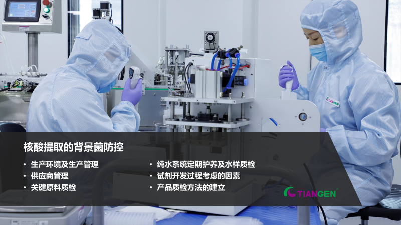 病原mNGS检测的灵敏度极高,为避免背景菌的存在影响病因排查和结果判定,做好病原核酸提取及文库构建试剂的背景菌防控是非常必要的。为了满足病原mNGS的检测需求,天根生化进一步优化了提取和建库产品的质检体系,在原有高洁净标准的生产基础上,同时增加了严格质控,实现背景菌防控的双保险。