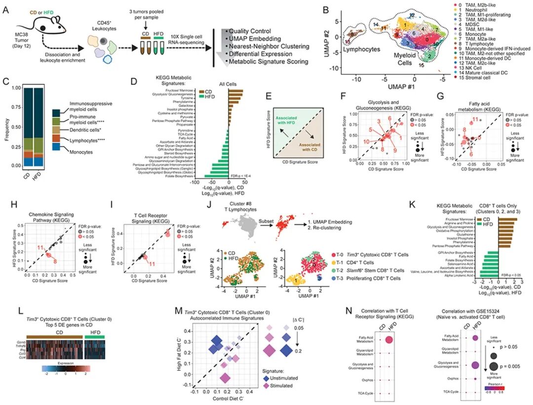 先构建肥胖小鼠模型(长期喂食 60% 脂肪供能的高脂饮食),与普通饮食组(10% 脂肪供能)对照,两组均接种肿瘤细胞。通过单细胞转录组检测免疫细胞基因表达,代谢组定位异常代谢物,蛋白质组验证关键分子,三层数据交叉印证。