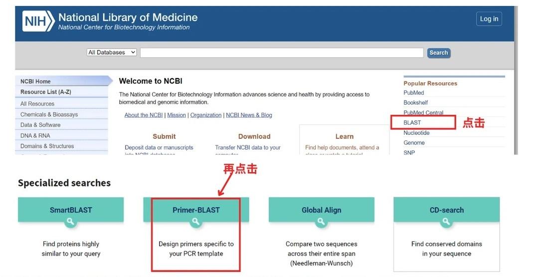 回到NCBI星空官方网页版点击BLAST跳转后下拉点击Primer-BLAST