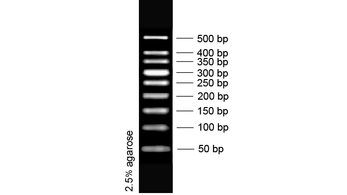 50 bp DNA Ladder 是由单独制备的 PCR 产物混合而成,共有 9 条 DNA 片段,已加入上样缓冲液,可直接电泳,每次上样 6