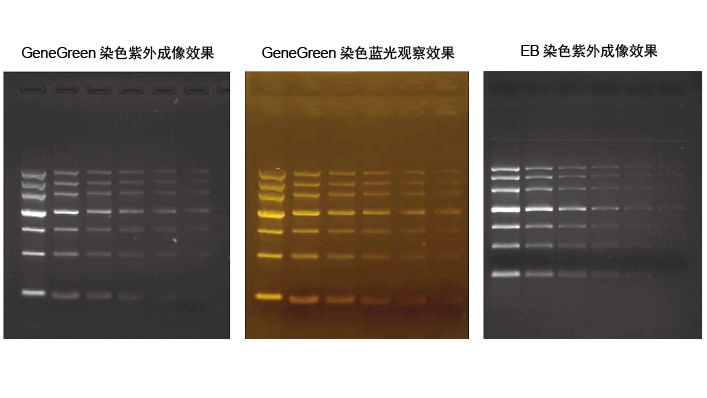 GeneGreen 核酸染料是一种以花菁为基础进行改良的油性大分子,降低了传统花菁类核酸染料在电泳过程中对核酸迁移率的影响,不会产生电泳条带弯曲现象。该染料不能穿透细胞膜进入活体细胞内,不易挥发而被吸入人体,诱变性远远低于EB。可在蓝色可见光激发装置下进行切胶回收,安全方便,是一种安全无毒、高灵敏的全新核酸染料。