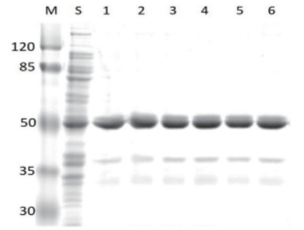 磁珠再生次数建议不超过2次。 磁珠后处理7次纯化目标蛋白的电泳图